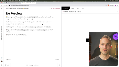 00:00 Okay, so we're on a new exercise step. So the first thing we always do, set to playground. And when we do, we're going to get this new user interface here that is a non-UI exercise. So some of our workshops have no preview. They have no dev script in the package.json.