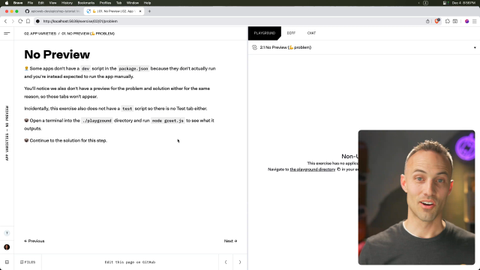 00:00 Okay, let's go to the next page here. We're now on the solution for the no preview exercise steps, so we're exercise two, step one. There's not a whole lot going on over here. So again, the no UI exercise and the no preview here is mostly for testing workshops, lower level sorts of things, things where you're expected to run scripts manually. I did consider and maybe still in the future, making it so that you can actually run scripts right in here and have a terminal emulator here.
