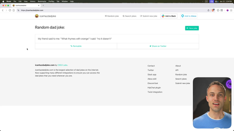 00:00 Hey. Well done on this first exercise. Let's get into a dad joke. You're gonna see these on the breaks. Breaks are important.
