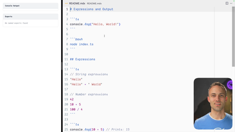 00:30 We will get to them, I promise. We're going to use a special API called console dot log. You're gonna pass it an argument, that is a string, and then you're going to use node or, the epic workshop, interface to view what those console outputs look like. We're also gonna be talking about expressions, two particular types, so string expressions and number expressions. There are a lot of different other types of expressions that we'll get into later on.