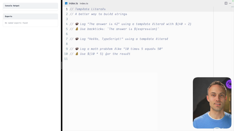01:09 But this, gives you an idea. And here we can do quotes, hello, TypeScript, or, hello, TypeScript with a single quote. Now you don't have to worry about it. Although, you do have the other problem. Now what if I wanted to actually show a backtick in my output?