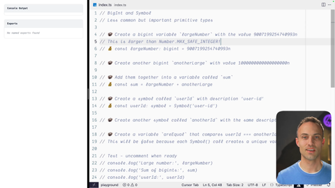 00:00 Alright. Let's go ahead and solve this one. Hope you had a good time with it. So because numbers are limited to around nine quadrillion, so maybe sometimes you'll run into a situation where you need to store something bigger than that. JavaScript has a solution to this and it's called bigint, where you can just store arbitrarily large numbers.