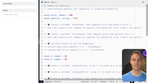 00:00 So now we can do some comparisons. So, we are going to, compare different prices, the quantity. You'll notice this is set to be a string, which is kind of incorrect. And then we've got a couple other numbers down here to do some comparisons between some variables. This is something you're gonna use all the time in your programming in TypeScript, so I'm really excited for you to give this a whirl.