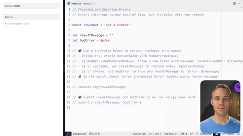 00:00 Okay. Sometimes things don't go the way you were expecting. Sometimes somebody gives your function as something you weren't expecting and you need to throw an error to let them know, hey, this is gonna be a problem for you. You need to pass the right thing or whatever. And we haven't talked about functions quite yet, but this is where being able to throw your own errors comes in especially handy.