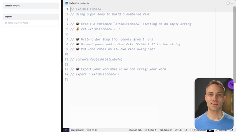 00:26 So that is what we're doing with for loops. And this is a pretty primitive concept in most programming languages. And so you're going to be experiencing, something that's really pivotal and important for lots of programs. Jumping into for loops, we'll see you when you're done.