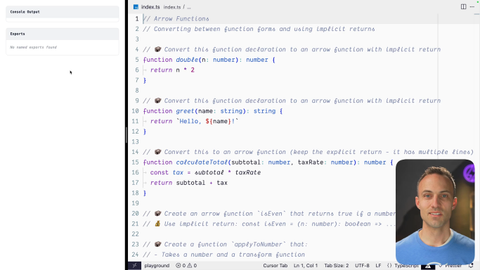 00:18 There's also generator functions and stuff. We're we're so and async functions. We're not getting into every function type, in this exercise. We're gonna focus on, function declarations, which we've done so far, and arrow functions. They're actually features of arrow functions that we're not gonna dive too deep into either because they require knowledge of other things that we're gonna get to later.
