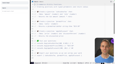 00:17 But basically, your function can accept some input from whoever's calling it and then use that input to create some result often to return some value or to perform some, operation somewhere or whatever. And so this makes our functions way more useful because with just a get message, like, that's not all that useful. But what if I wanted to say hello so and so? Then I could say pass me the name and I'll say hello to that name. So your job in this exercise is to make some ecommerce utility functions like, computing the, a discount or calculating tax, all of that stuff, formatting price, stuff like that.