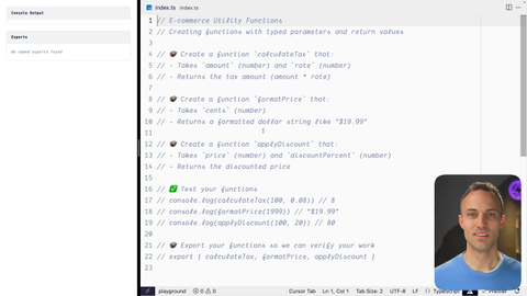 00:00 Okay. Let's get into it. Ecommerce utility functions. So, our first function is going to be called calculate tax. We're gonna make that, by using the function keyword and then we have a space and then the name and then our yep.