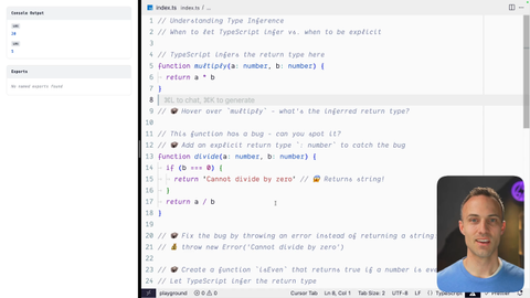 00:08 What we've done so far. You can actually remove that and TypeScript knows just by looking at what the function is doing or specifically looking at what is being returned that the return value is a number. And I don't think that I've mentioned this yet, but I I probably should. You don't have to return anything from a function. When you don't, then the return type is called void.