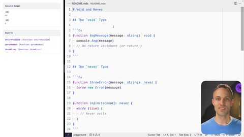 00:00 Okay. In this exercise, we're gonna talk about void and never. These are, never is a TypeScript only concept and void is actually both a JavaScript and TypeScript, concept. But we're gonna be focusing our, energy on the TypeScript side of things. So here, let's talk about the void type here really quick.