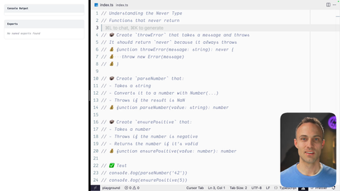 02:38 Otherwise, do this thing. And in that case, it, will the types will flow a lot better. But, anyway, that is, the, never type. Let's continue from here just to get a couple more reps and and look at a couple other things. So here, in this case, we've got our parse number.