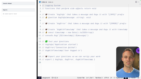 00:00 Okay. Let's just build out what this has for us. So we're making a a logging system. So I'm gonna make a function called log info that, simply logs, but we're gonna have this prefix of info. And that that's what makes it a logging system.