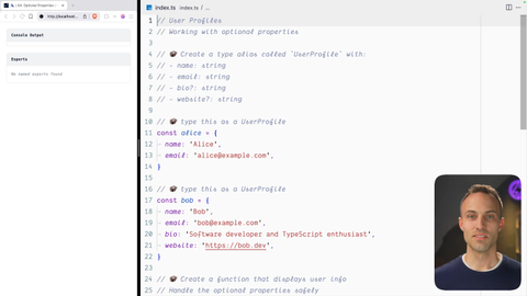 00:00 Alright. So sometimes you might have a type or an object that, has some versions of that have properties that are optional. So some might have it, some might not. So in our example of our user profiles, Alice has a name and an email, but not a bio and a website. So how do you type this and how do you, access those properties if they may or may not be there?