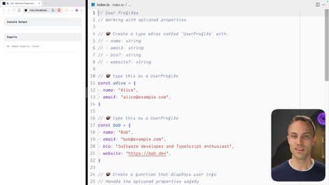 00:09 But bio and website, these are optional. And so now we can specifically type Alice and Bob with those, with the that type and that can protect us against, making these silly mistakes here and there. And I should mention also that often I don't find myself explicitly typing things because usually, I'm gonna be passing this object to some, function that has a type definition, and we'll look at that when we get into the type safety stuff. But, and then I'll I'll catch the problem at that point. And so, while you'll be seeing me doing this a lot, in our exercises and things because the way things are structured, once you get into, real, TypeScript code bases, you'll find that TypeScript is actually really good at inferring what you're trying to accomplish.
