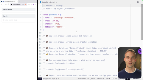 00:00 Alright. So now that we have created an object, how do we access the properties of that object so that we can do things with them? That's what this exercise is all about. You've got the instructions right in front of you, so get into it.