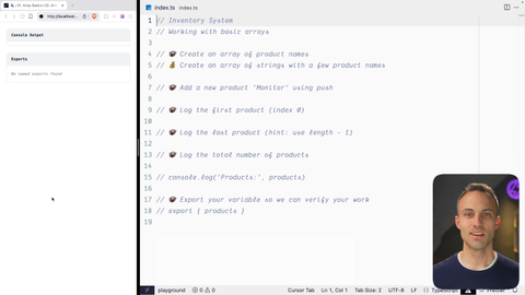 00:05 There's a joke in there somewhere. Alright. In this exercise step, you're going to make an inventory system and we're going to have a list of inventory items that you're going to need to interact with. So jump on into arrays and let's just get into it.