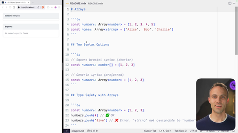 01:31 So as far as type safety is concerned, once you have that type in place, then it ensures that you can only push the right types of things into it, which, by the way, you can, add items to an array with the push method. There are actually other ways that you can add items to an array. But, yeah, the push is what we're gonna be doing today. And, if you had mixed types, an array with multiple different kinds of things, then you use this union, syntax, which we haven't really talked about yet, but you'll get to that eventually. Don't worry.