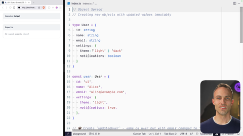 00:21 I use this all the time. And in fact, there's a little Kent C Dodds lore that, this feature, had a part to play in my, job that I got at PayPal. So if you want to, you can ask me about that some other time. But, object spread, we're going to create new objects, with some updated values by combining objects together and stuff. And I think that you're gonna have a good time with this one.