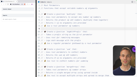00:24 So there's actually a syntactical solution to this called rest parameters. And that's what we're gonna learn about in this exercise. So I want you to jump in there, make your rest parameters functions. And when you're done, you can come with me to the solution. We'll work through it together.