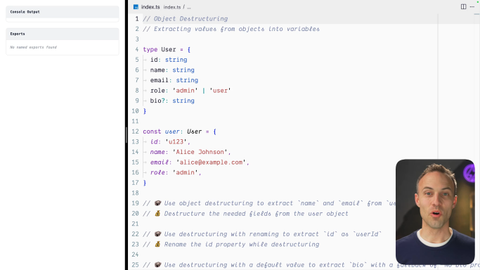 00:00 This is another one of my favorite features. I I guess I can't choose a favorite because object destructuring is just fabulous. It's awesome. So in this exercise, we're going to go from accessing individual properties and and, making variables out of those to be able being able to have just a single line or a single statement that, grabs objects out of, properties and and assigns variables to that. Really useful, especially when we're talking about function argument lists where you have an options, argument and you wanna just grab the different options and have variable names for those individually and stuff.