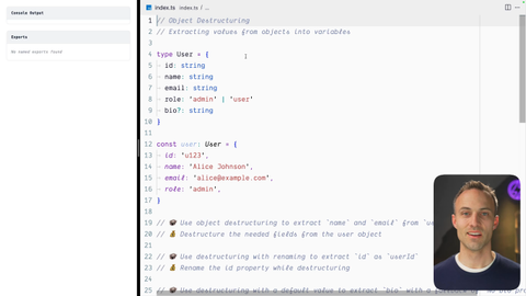 00:00 Alright. Let's get into it. So we've got our user type and user object, and we want to grab both the, name and the email from the user. And to do that, typically, we would say const name equals user dot name and const email equals user dot email and so on and so forth for every property that we want. This can be really irritating and annoying and so what we can do instead, what is roughly equivalent is to, say const and then curly braces name comma email curly braces equals user.