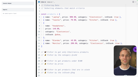 00:00 Alright. Now it's time to filter things with arrays. So you can have this array of like seven items and then you filter it down and the new array you get has like three items because the things inside of this array you wanted to get out and get rid of. So, it's actually really powerful when used in combination with map. So let's go ahead and get into this exercise and we can talk all about it.