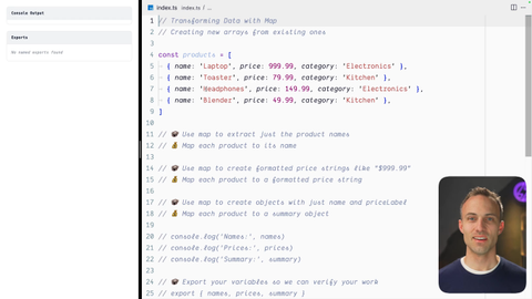 00:11 And then by the end, the result that you get is an array that is the transformed version of all the items of that other array. Really great. I use it all the time. So I'm gonna have you jump in and do it for this one. Have a good time.