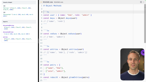 00:34 And so here we got object dot keys, values and entries. And the reason I'm and also from entries. And the reason I'm teaching you these after we learned the array methods is because these actually turn your objects into arrays. So it becomes a lot more useful once you have a really good understanding of how arrays work. So, yeah.
