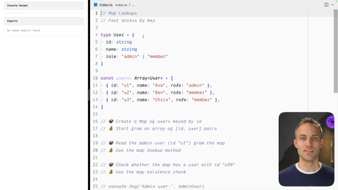 00:00 Great. Now we can explore maps a little bit. And, of course, not the map that you look at at your phone when you're looking for the closest CVS because you got a nosebleed or something or whatever. But the kind of map that, you use in JavaScript, The the kind that allows you to, look up anything in this data structure very quickly and efficiently and it's great. So, you're gonna create a map with, this array of users and stuff, and it's gonna be great.
