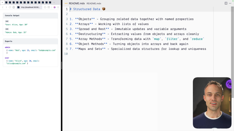 00:00 Alright. Welcome to the structured data workshop. I'm so happy that you're here and we're going to learn how to structure data in TypeScript and JavaScript using the primitive, primitives that are allowed or or provided to us by the JavaScript language. I'm really excited about this. We're gonna learn about all kinds of things, objects, arrays, spread and rest, destructureing, array methods, object methods, and maps and sets.
