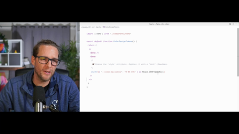 00:00 All right, so we want our dark mode to work and respond to the class of dark. So I'll remove this placeholder style attribute we had and instead add class name, dark. And the first thing we need to do is in the config file, let me collapse these crazy objects here.