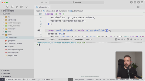 00:36 which we just need for our monorepo. And so if we run the release process again, that error should disappear. So you can now see it tries to publish, but we don't have any version running, and so therefore it didn't run. But another way you can do is to go into the nx.json and define which projects should be included in the publishing and releasing and versioning process.