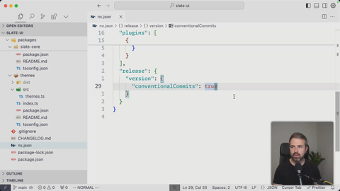 00:37 we want to have project changelogs and set that to true. And we also want to have workspace changelogs. So the workspace changelog is the one that we just saw at the very root of the project workspace here of our monorepo. And the project changelog will be per project. Now I have here already a bunch of commits
