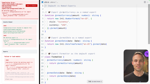 00:00 Alright. So this exercise is kind of broken, and that's because you haven't done your job yet. So your job is to add some exports. We're gonna do both named and default exports so you can kind of see what the difference is. And I'll talk about why I think you should probably never do a default export.