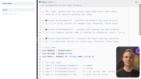 00:00 Alright. So now, we're gonna get into a couple more advanced things specifically with infer so that you can get some experience with that. We're gonna recreate very simple basic versions of some other built in types just so that you get familiar with how infer works. So jump right in.