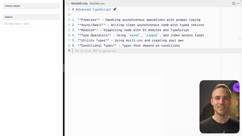 00:00 Hey there. Welcome to the advanced TypeScript workshop. This is going to go through some of the more advanced concepts in TypeScript, not just typings, but also like regular JavaScript concepts that are of the more advanced variety. So we're gonna talk about promises and async await. This is very foundational, super important, but it can be a little bit of a mind bend, for when we're talking about asynchrony and all of that stuff.