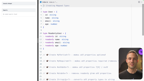 00:00 Alright. Now, we're gonna put you to the test. How good are you at generic types? We're actually going to have you reimplement the, a couple utility types that are built into TypeScript. This is one of the best ways to practice your abilities at things because their product decisions have already been made.