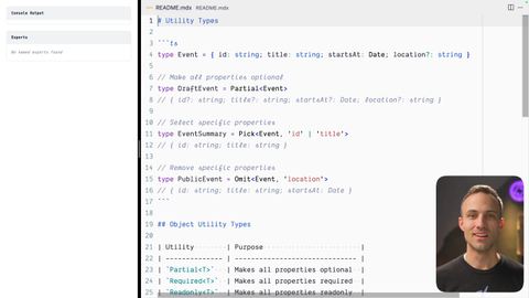 00:00 Alright. Welcome to the utility types exercise. Very excited about this one. TypeScript has tons of types that are built in, like generic types that you can use to do all kinds of things with your types. It's basically a library of types that is, built into TypeScript and it's super useful.