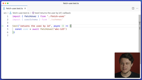 00:00 Let's say we're testing this fetchUser function that accepts the userId and returns back the user object. And what we want to do in this test case is to make sure that this user object matches our user schema, the one we have over here. So this expectation is rather straightforward.