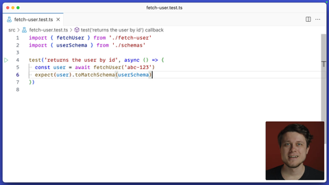 00:15 the user schema. What it actually does under the hood, whether it's a strict or loose equality comparison, or some custom logic like parsing a schema, is irrelevant. What matters is that the expected value here is a literal value. That makes it symmetric. You've used plenty of