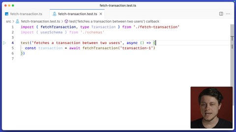 00:00 In this one, we are testing this FetchTransaction function that accepts the transaction ID as an argument and then returns the promise that eventually resolves to this transaction object. If we take a look at this object, it's described in this interface, we can see that it has properties ID of type string, issuer of the type user, and the recipient also of the type user.