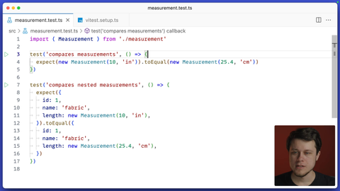 00:00 To have this test passing, I need to make VTEST understand how to compare different measurements, even if they have different values and measurement units. To do that, I can define a custom equality tester. That function will tell the VTEST how exactly to apply this to equal matcher when we