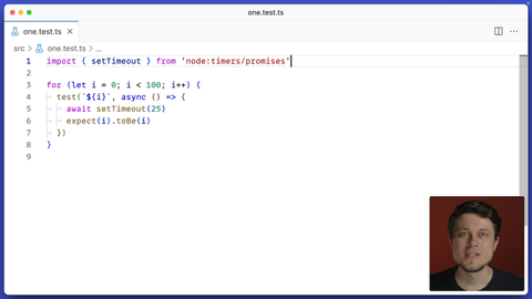 00:00 To tell Vitas that it should run some of your test cases concurrently, you have to change the way you declare your test. From the test function to test.concurrent function. Introducing this change will let Vitas know that this test case is concurrent. Because I'm creating test cases in a loop, it means that every test case created will be concurrent.