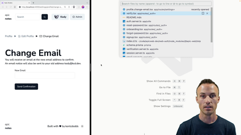 00:00 In our change email route, we've got this handle verification. This is going to be called when the user has successfully verified their ownership of the new email address. We sent that email to the email that they said, hey, I want to change it to this new email. I'll say kodyatexample.com.