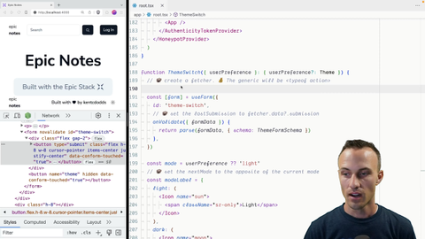 00:00 Our first step here is going to be making it so that we actually render the theme that the user wants to have set in our form. So we're going to render a hidden input. So input type is hidden, and the name is going to be theme, and the value will actually be the next mode. So the value will be the value the user