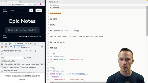 00:00 We're going to talk about cookies, and we're finally going to get dark mode on our app. Isn't that wonderful? And it's awesome, actually. We're going to be doing optimistic UI. So our theme requires some server-side interaction to get server rendering of our theme. And you'll notice we're on a slow 3G network, but it is still lightning fast.
