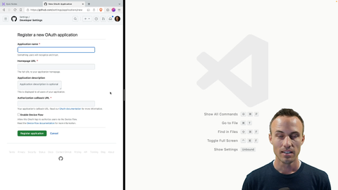 00:00 To get started, let's create our OAuth application on github.com slash settings slash application slash new. If you're using github for your OAuth and this is where you're going to go if you're using Google or Twitter or wherever, they're all going to have their