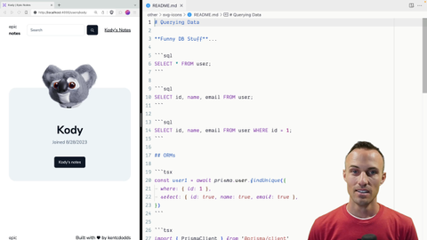 00:18 And so here if I go to Cody's notes and I go to the first one You'll notice it's actually already gone and that's because at I have deleted that note from the in-memory database But it's showing up in here because here I'm loading it from the actual database That's what we're going to get to at the end of this exercise And so we are going to be in kind of a funny place