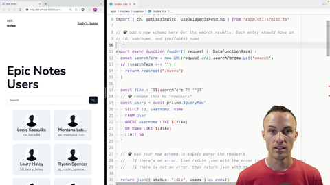 03:03 We got a couple of other things that we want to do here, but let's just double check. I can search for Co and there's Cody. So we're in a good place there and everything is nice and type safe. If I miss the username, then we're going to get our error and we need to display that error message. So I'm going to leave that error state right there