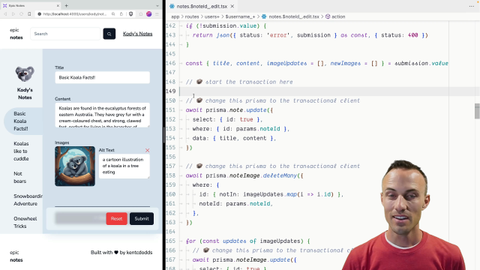 00:00 This is a little bit easier and also a little bit trickier than you might expect. So the easy part of it is we simply add prisma.transaction and Copilot wants us to do the array syntax. I don't wanna do that. We're gonna have an async function and it's gonna take an argument I'm gonna call $prisma.